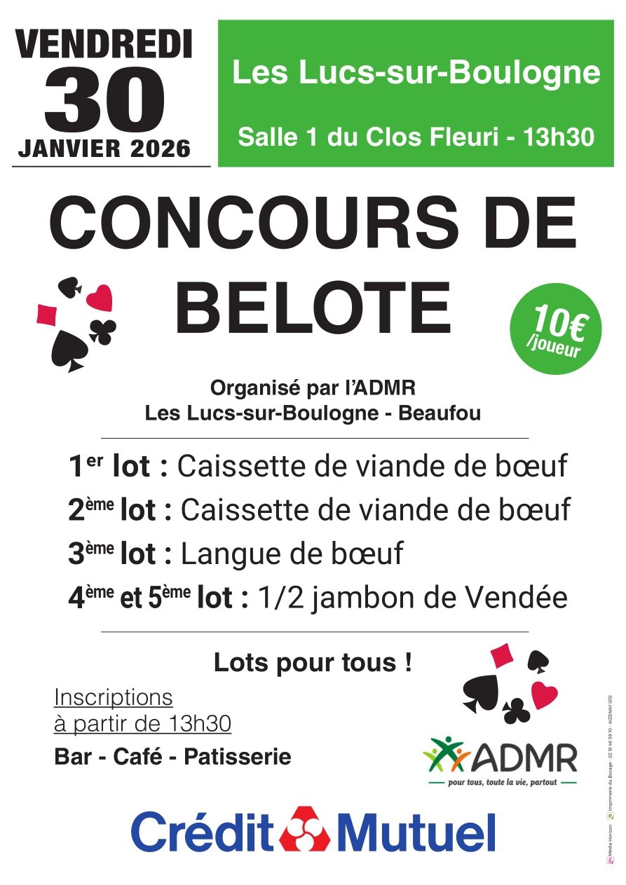 Organisé par l'ADMR Les Lucs-sur-Boulogne - Beaufou. Ouvert à tous. Inscriptions à partir de 13 h 30 (10 € par joueur) et début du concours prévu à 14 h. Lots pour tous les participants, pas de perdants. Bar, café et pâtisseries. Vendredi 30 Janvier 2026 de 13 h 30 à 18 h 30, Salle n° 1 du Clos Fleuri, boulevard Jean yole, Les Lucs-sur-Boulogne.