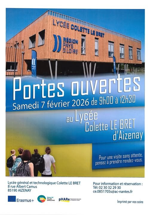 Les portes ouvertes du lycée Colette Le Bret d'Aizenay auront lieu le samedi 7 février 2026 de 9h00 à 12h30
