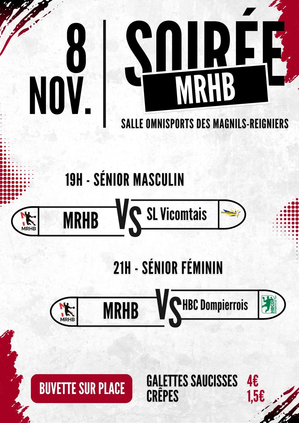 Nous vous invitons pour une soirée exceptionnelle le Samedi 8 Novembre à la salle Omnisports des Magnils-Reigniers pour assister aux deux matchs de nos équipes seniors !!