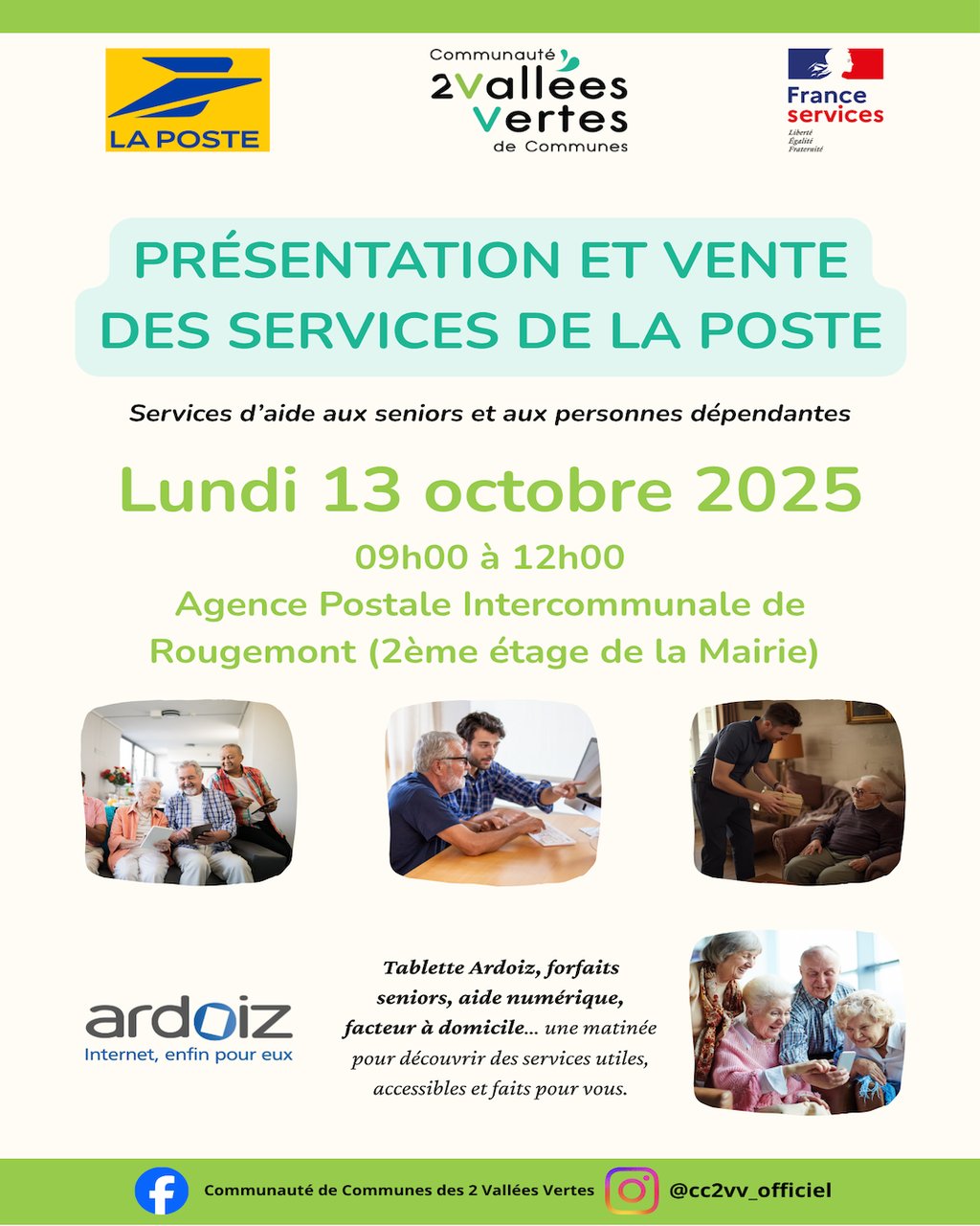 La Poste, en partenariat avec la Communauté de Communes des 2 Vallées Vertes et France Services, organise une matinée dédiée aux services pour les seniors et les personnes dépendantes.