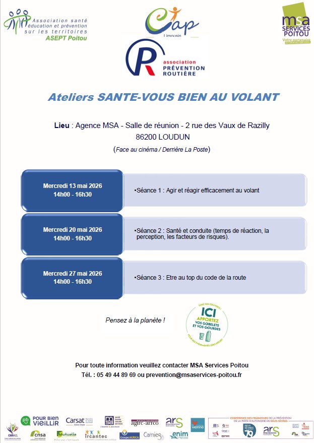Dans une démarche de prévention santé, l’ensemble des caisses de retraite en coordination avec l’ASEPT Poitou et la MSA Services Poitou, vous propose de participer à ces 3 séances de prévention sur les thèmes suivants : Savoir agir et réagir efficacement au volant ; Savoir gérer les situations de stress ; Être au top du code de la route. Un groupe de 10 à 15 personnes est constitué pour l’ensemble du cycle.