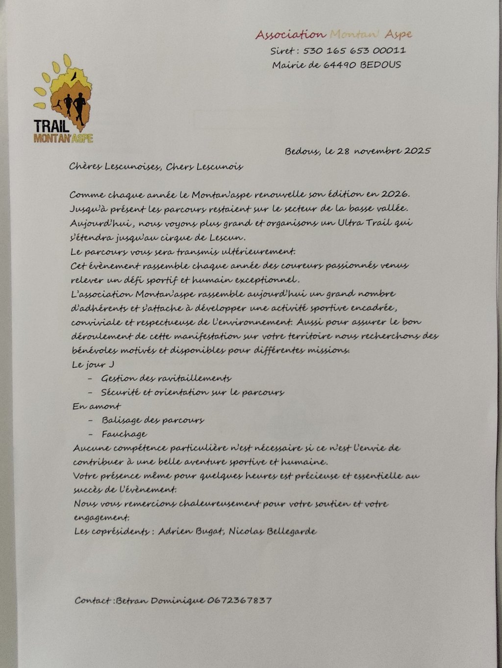 Veuillez trouver ci-joint un courrier de l'équipe de bénévoles de montan'aspe qui cherche du monde pour le trail qui passera par Lescun cette année