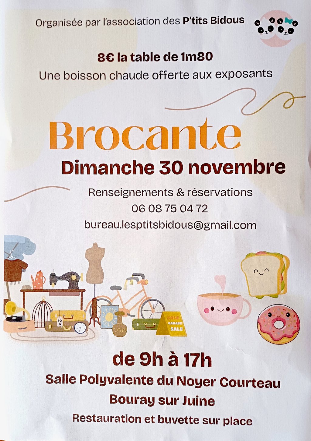 L'association Crèche Les P'tits Bidous propose une brocante en intérieur dimanche 30 novembre, de 9h à 17h, dans la grande salle du Noyer Courteau à Bouray-sur-juine. Tarif : 8€ la table d'1,80m.