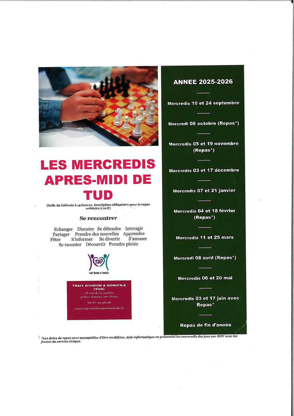 Le dernier rendez-vous de l'année 2025 des "Mercredis Après-midi de TUD" avec « échange-détente-jeux » est programmé et animé par l'association Trait d'Union à Domicile les mercredi 11 et 25 mars à 14h salle Gâtinais. Rendez-vous nombreux !