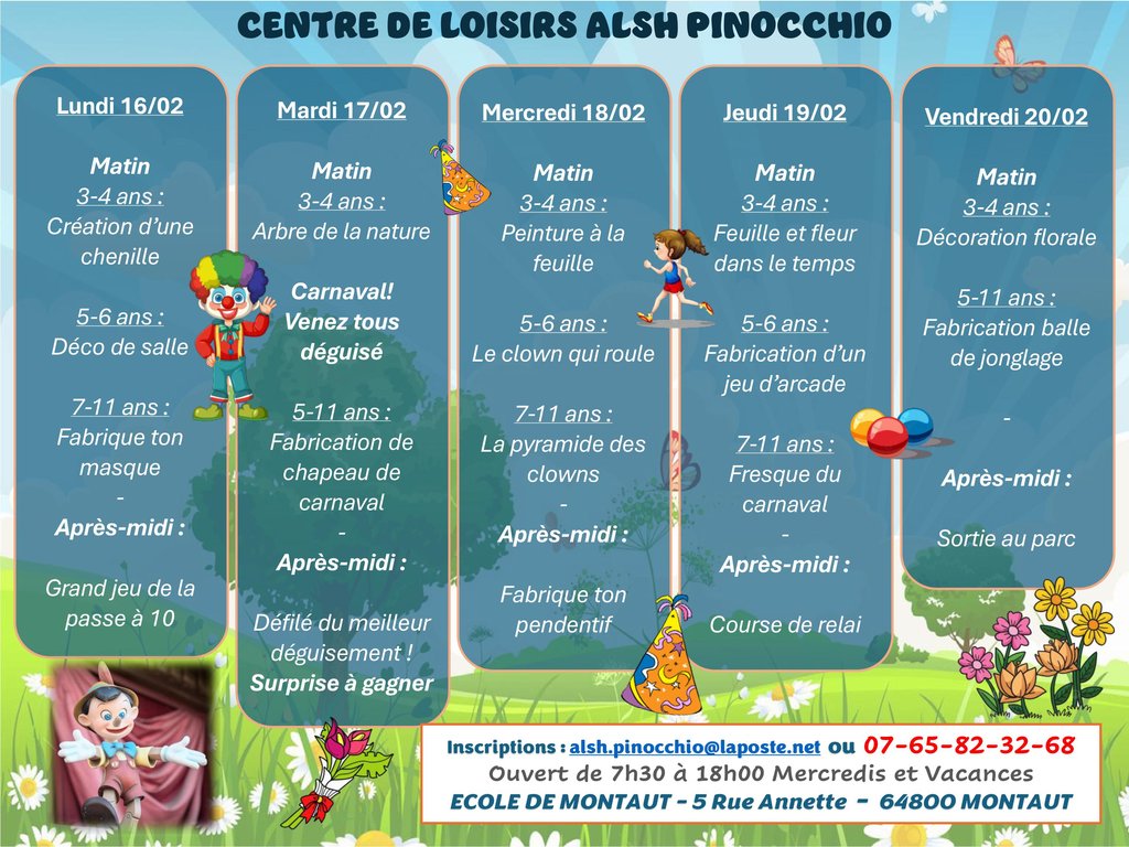 PROGRAMME DES ACTIVITÉS DES VACANCES DE FÉVRIER AU CENTRE DE LOISIRS PINOCCHIO