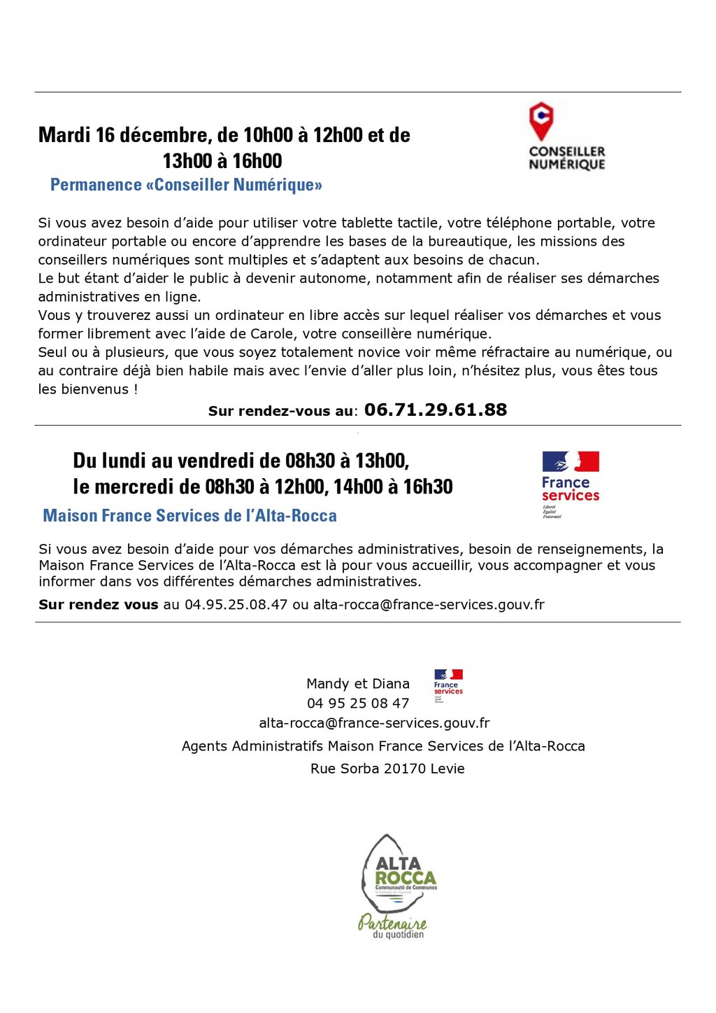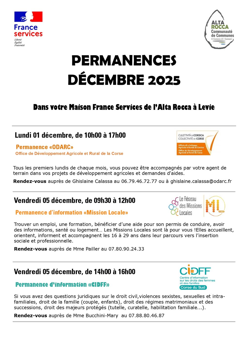 Retrouvez les permanences de France Services à Levie pour ce mois de décembre.