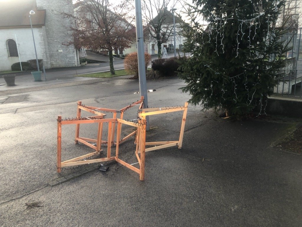 La Commune déplore la dégradation récente d'une décoration de Noël installée sur la Place du Village afin d'illuminer cette période de Fêtes. Le vent n'est pas la raison du déplacement de cette décoration, celle-ci étant ancrée solidement dans le gazon 50 mères plus bas !
