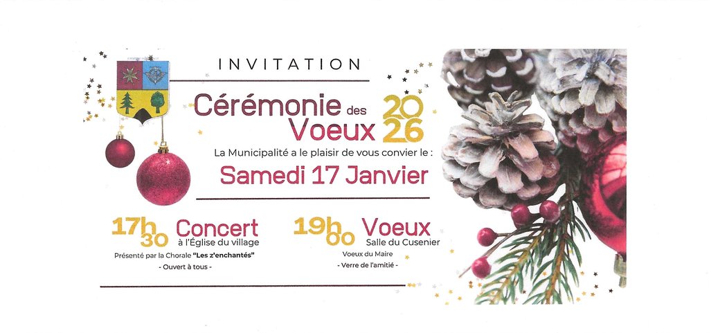 La Municipalité a le plaisir de vous convier samedi 17 janvier 2026, 19 h 00, salle du CUSENIER à sa traditionnelle présentation des Vœux suivie du Verre de l'Amitié 🎉🍷