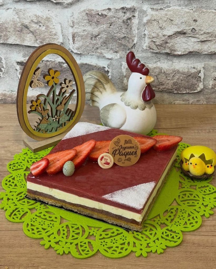 En exclusivité ce dimanche à la boulangerie, nous vous proposons un entremet de Pâques fruits de la passion & fraise ! 32 €