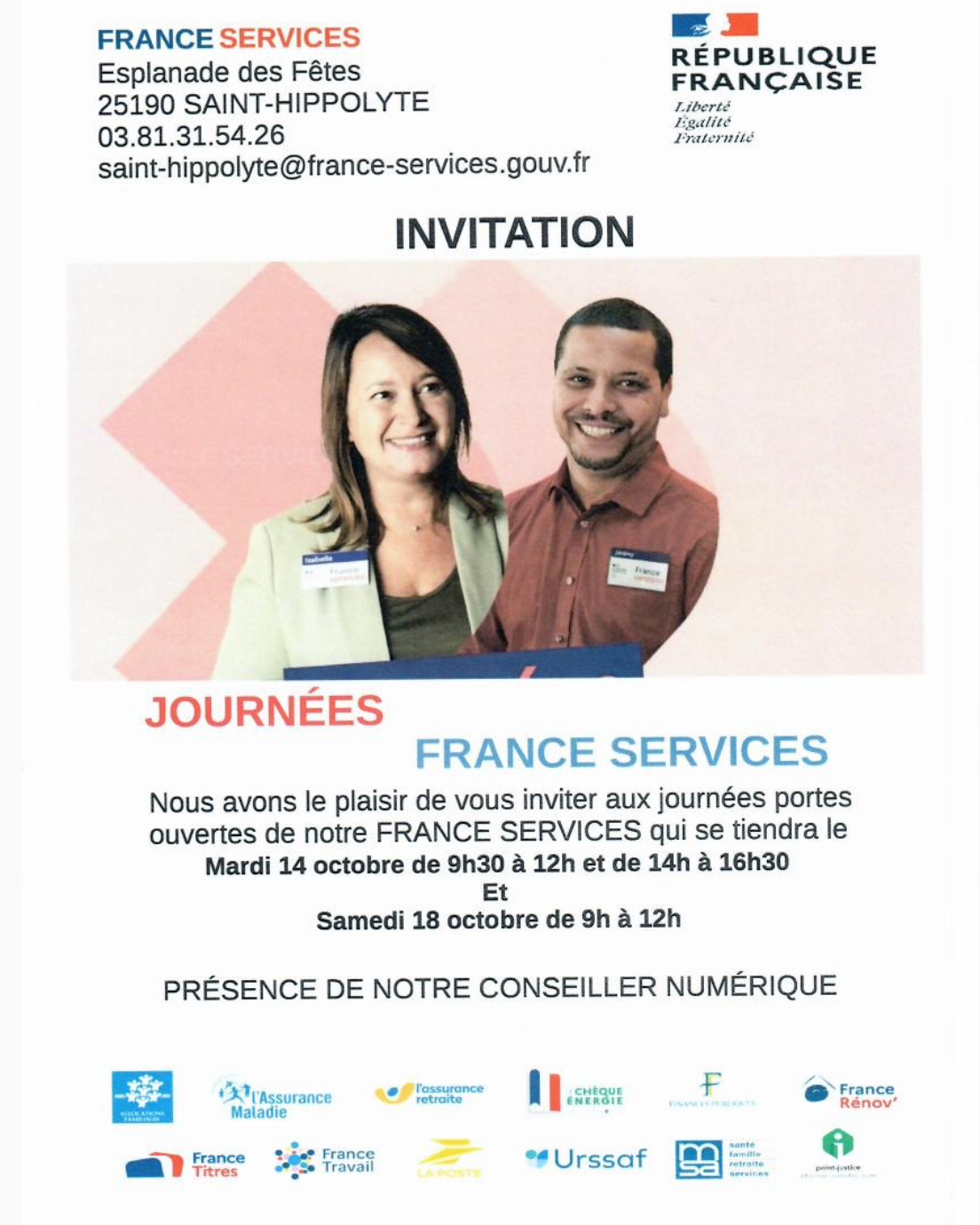 Mardi 14 octobre portes ouvertes de France Service à Saint-Hippolyte 9h30-12h / 14h-16h30 ainsi que le samedi 18 octobre 9h-12h.