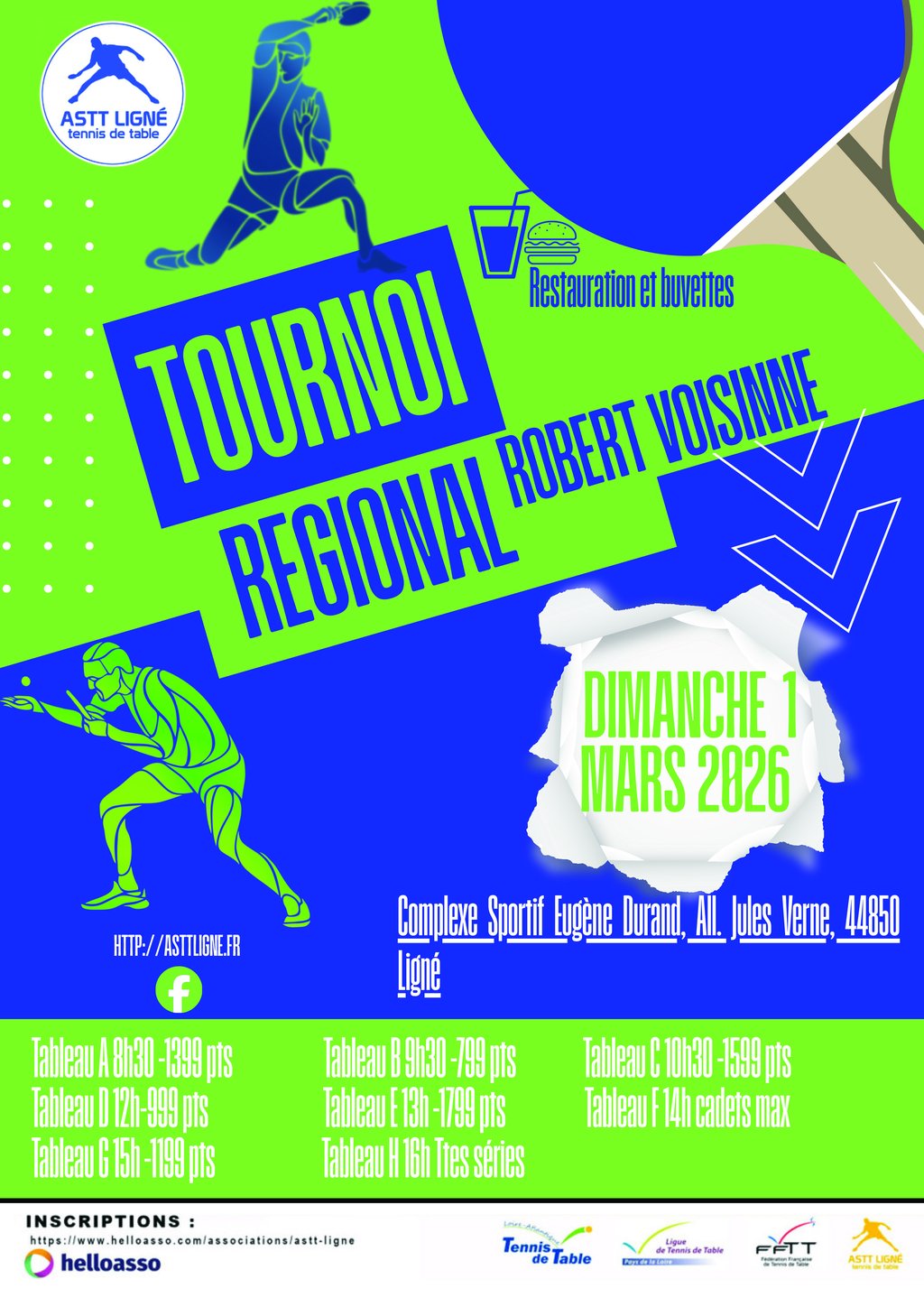 LâASTT LignĂ© a le plaisir dâannoncer lâorganisation de son grand tournoi Robert Voisinne, qui se tiendra le dimanche 1er mars 2026 au complexe EugĂšne Durand. Ce rendez-vous devenu incontournable rassemblera, comme chaque annĂ©e, de nombreux pongistes venus de toute la rĂ©gion pour partager un moment de compĂ©tition, de passion et de convivialitĂ©.
