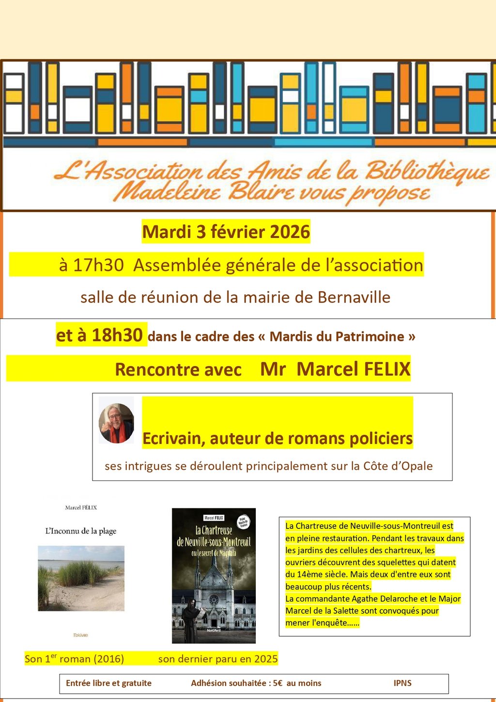 L'assemblée générale annuelle de l'association les amis de la bibliothèque Madeleine Blaire aura lieu le mardi 3 février à 17h30 à la salle de réunion de la mairie de Bernaville.