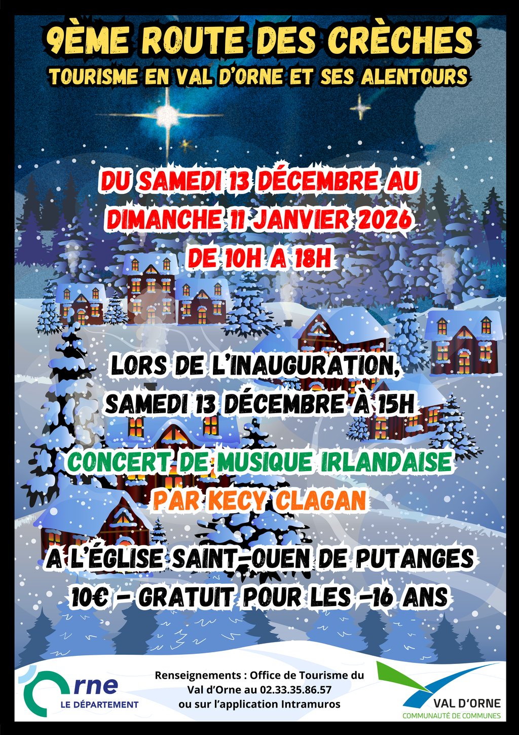 À l’occasion de l’inauguration de cette 9ème édition, un concert de Kecy Clagan (musiques irlandaises) aura lieu le samedi 13 décembre à 15h à l’Eglise Saint-Ouen de Putanges-Pont-Ecrepin. 10 € l’entrée et gratuit pour les -16 ans.