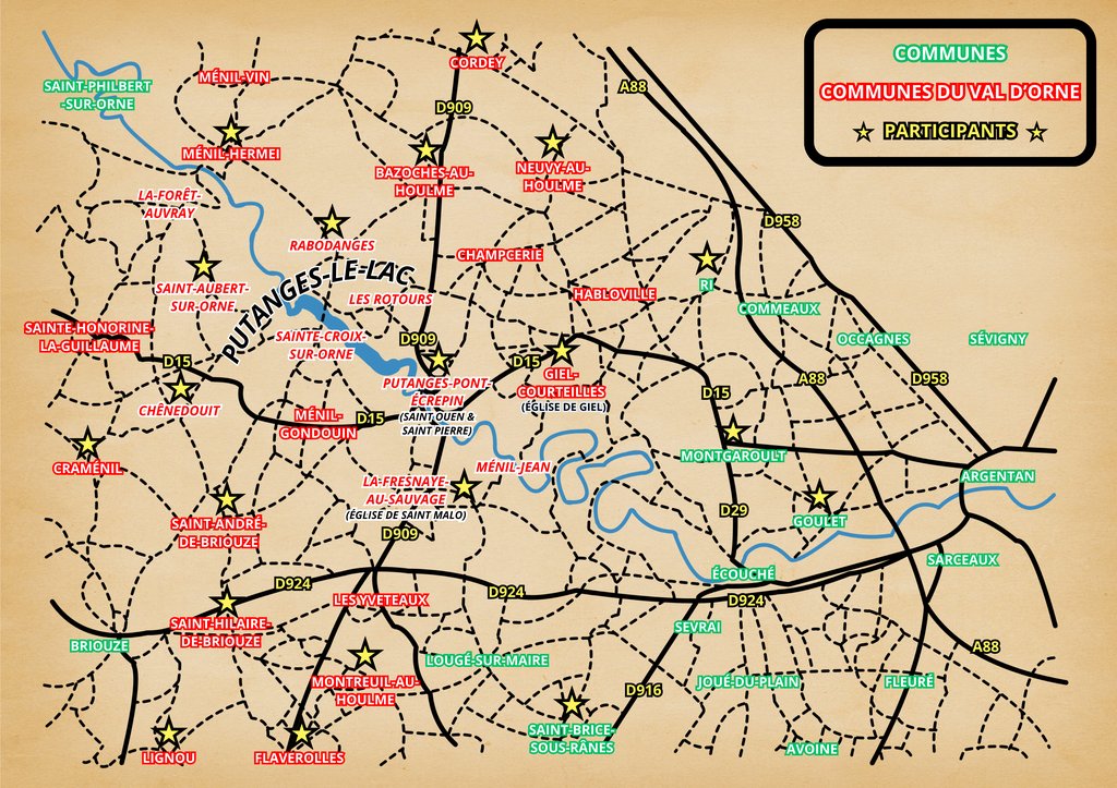 Communes participantes : Putanges-le-Lac ; Neuvy-au-Houlme ; Bazoches-au-Houlme ; Saint-Aubert-sur-Orne ; Chênedouit ; Sainte-Croix-sur-Orne (chapelle) ; Giel-Courteilles (église de Giel) ; La Fresnaye-au-Sauvage (église de Saint-Malo) ; Goulet ; Montgaroult ; Montreuil-au-Houlme ; Faverolles ; Saint-Hilaire-de-Briouze ; Lignou ; Saint-Brice-sous-Rânes ; Ri ; Ménil-Hermei ; Putanges-Pont-Écrepin (églises Saint-Pierre et Saint-Ouen) ; Craménil ; Rabodanges ; Cordey