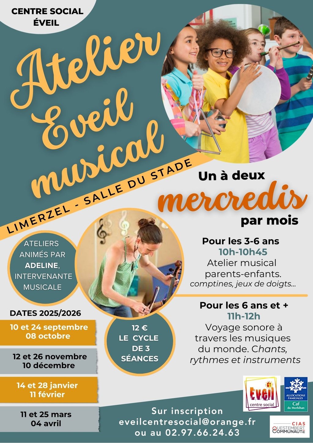 Le centre social propose des séances d'éveil musical pour les enfants de 3 à 6 ans (comptines, jeux de doigts...) et pour les 6 ans et plus (voyage sonore à travers les musiques du monde ; chant, rythme et instruments). Les ateliers, animés par Adeline, intervenante musicale, se dérouleront de septembre à avril par cycle de 3 séances progressives un à deux mercredis par mois. Possibilité de s'inscrire à l'année ou sur un ou plusieurs cycles.