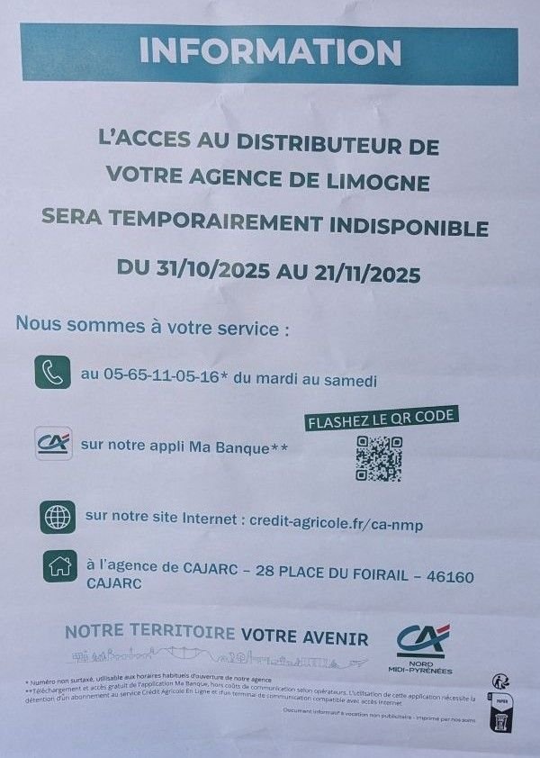 Fermeture temporaire du distributeur de billet du Crédit Agricole du 31/10/2025 au 21/11/2025