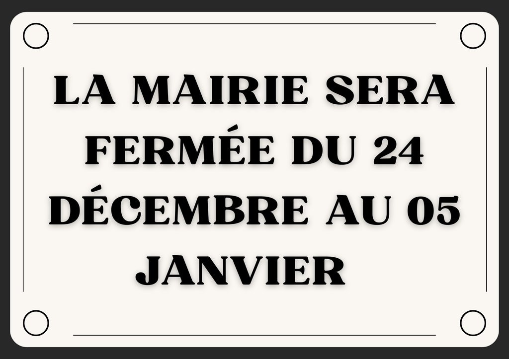 La mairie sera fermée du mardi 24 décembre au lundi 05 janvier.