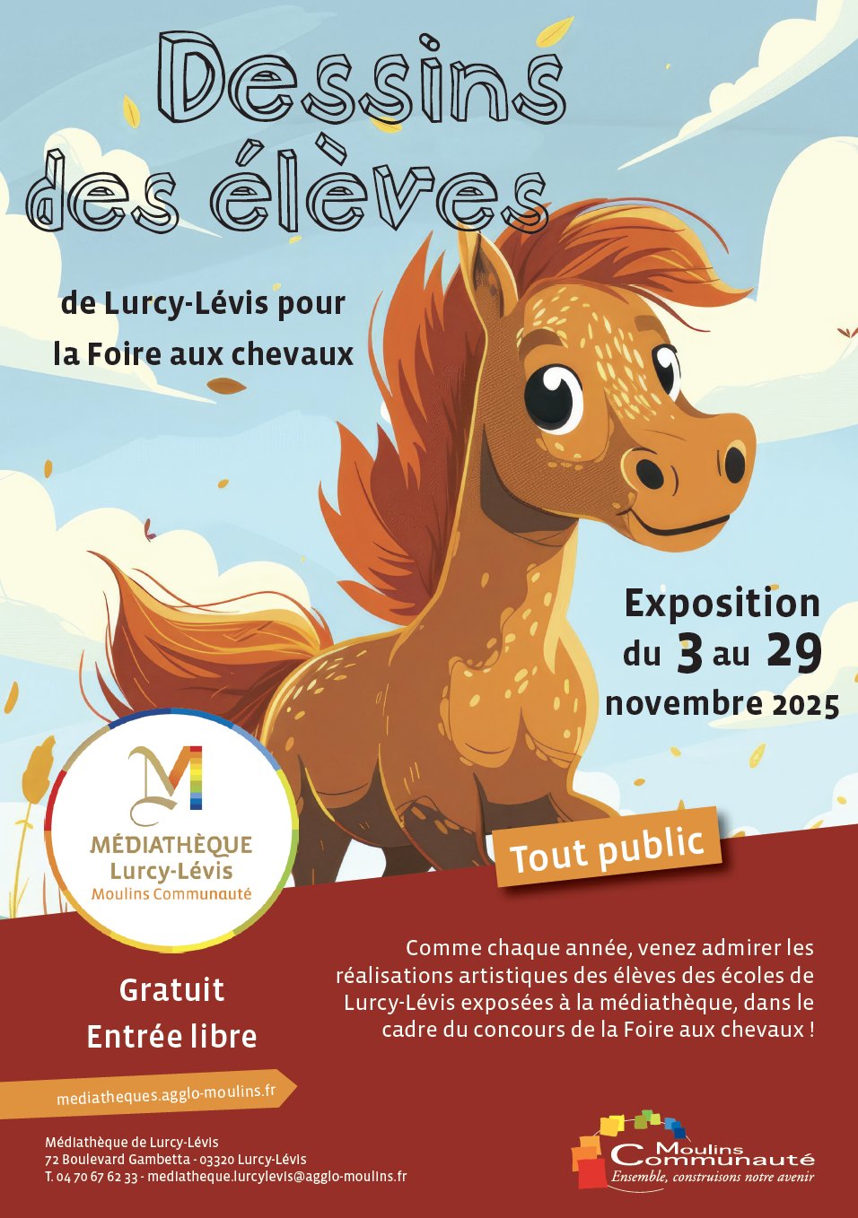 Comme chaque année, venez admirer les réalisations artistiques des élèves des écoles de Lurcy-Lévis exposées à la médiathèque, dans le cadre du concours de la Foire aux chevaux !