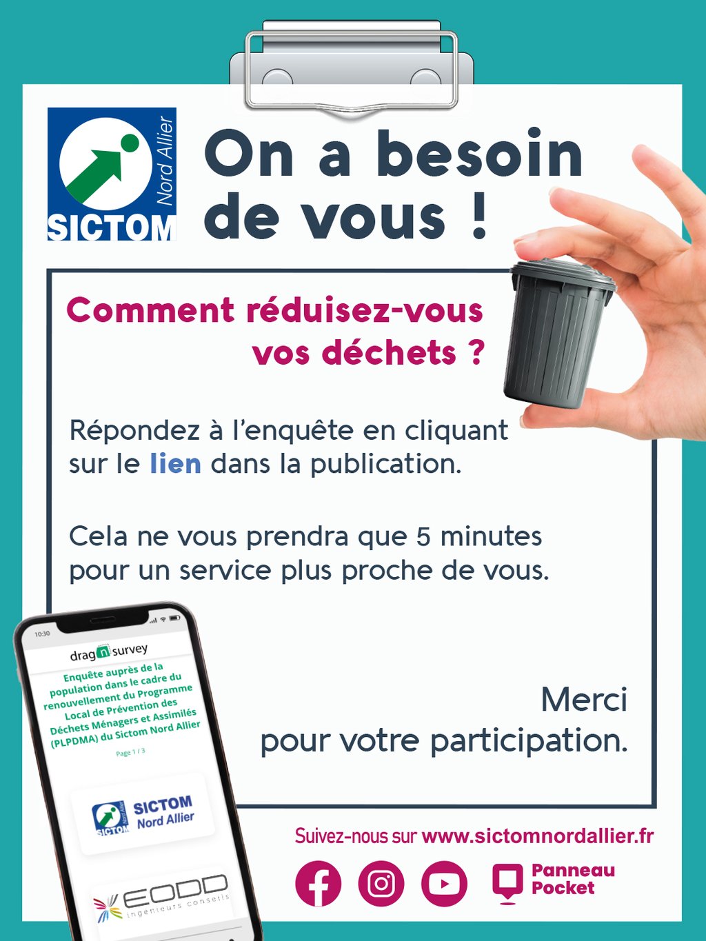 Compostage, seconde main, réparation… Quelles sont vos pratiques et quels projets souhaitez-vous voir se développer sur votre territoire pour vous aider à réduire vos déchets ? Pour vous offrir un service toujours plus adapté, le Sictom Nord Allier fait appel à vous. Une enquête pour connaître vos habitudes et vos attentes est lancée. Vos réponses serviront à l’élaboration d’actions diverses en faveur de la réduction des déchets.