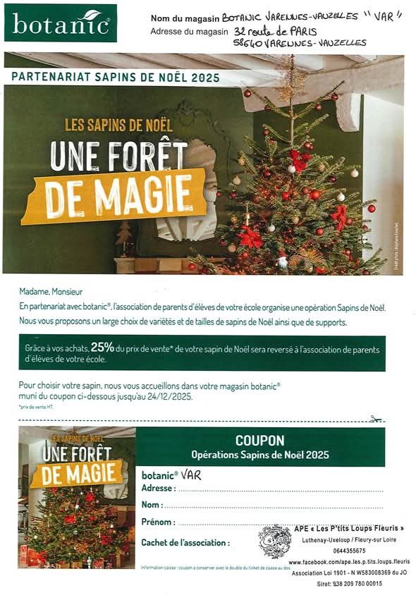 Pour tout achat de sapin naturel entre le 5/11/2025 et le 24/12/2025, Botanic®.vous offre un bon de 15 € valable du 02/01/2026 au 31/01/2026 dès 50 € d’achats en magasin. (Sur présentation du ticket de caisse et du bon)