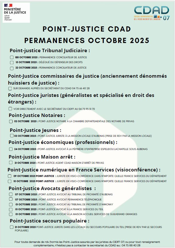 Pour toute demande de rdv (hormis les Point-Justice assurés par les juristes du CIDFF 07) ou pour tout renseignement complémentaire, n’hésitez pas à contacter le secrétariat du CDAD au : 04 75 66 40 28.