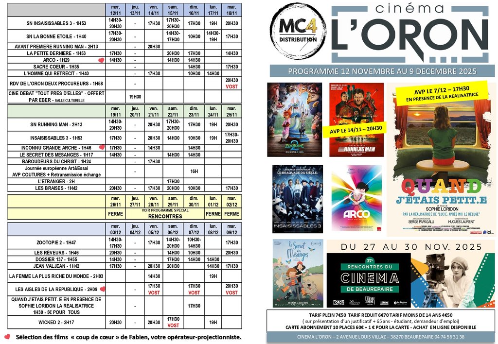 Programme du cinéma l’ Oron du 12 novembre au 9 décembre 2025