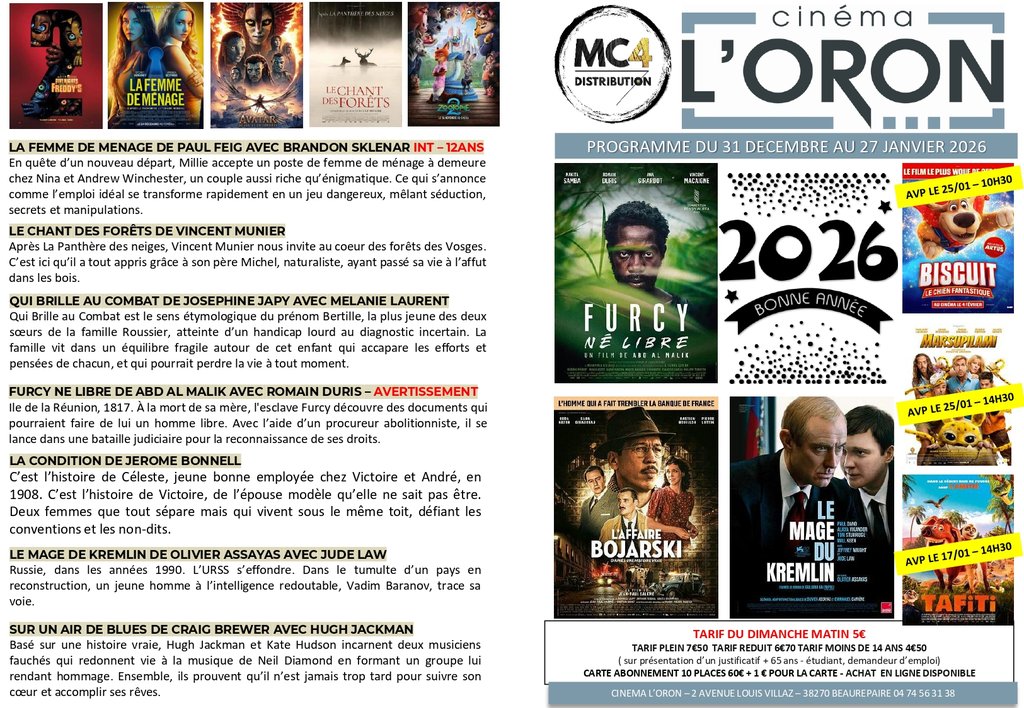 Programme du cinéma l’Oron du 31 décembre au 27 janvier 2026
