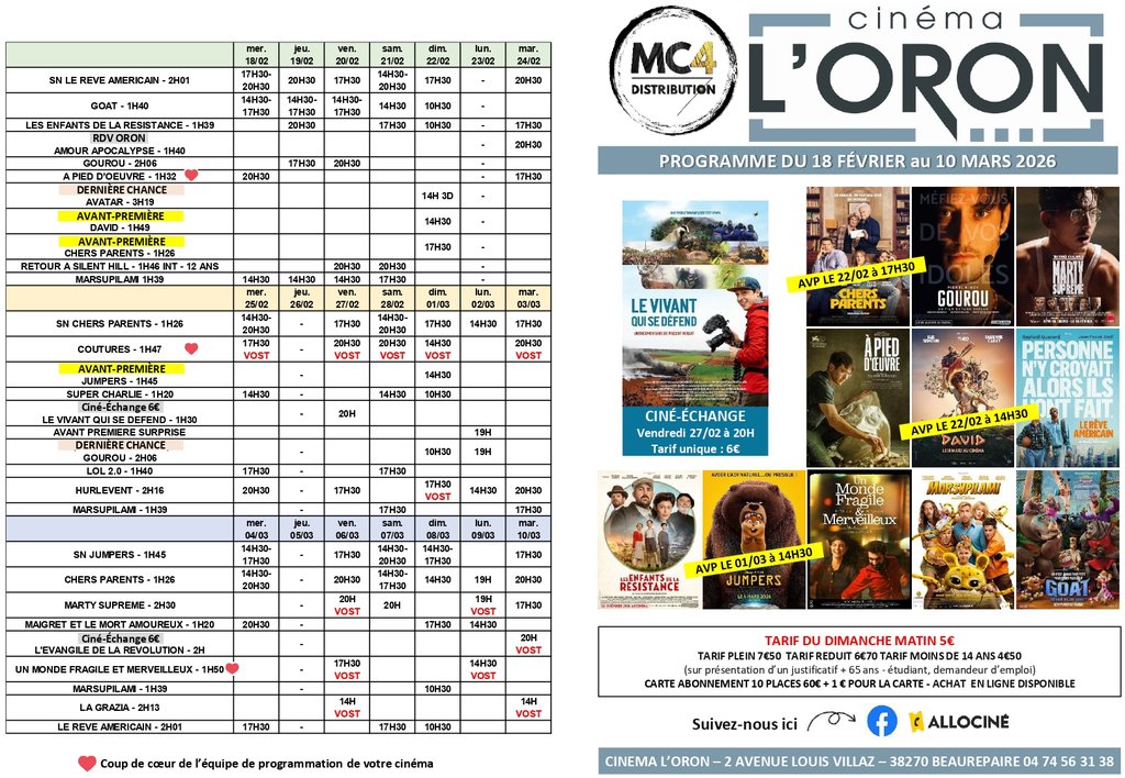 Programme du cinéma l’Oron du 18 Février au 10 Mars 2026