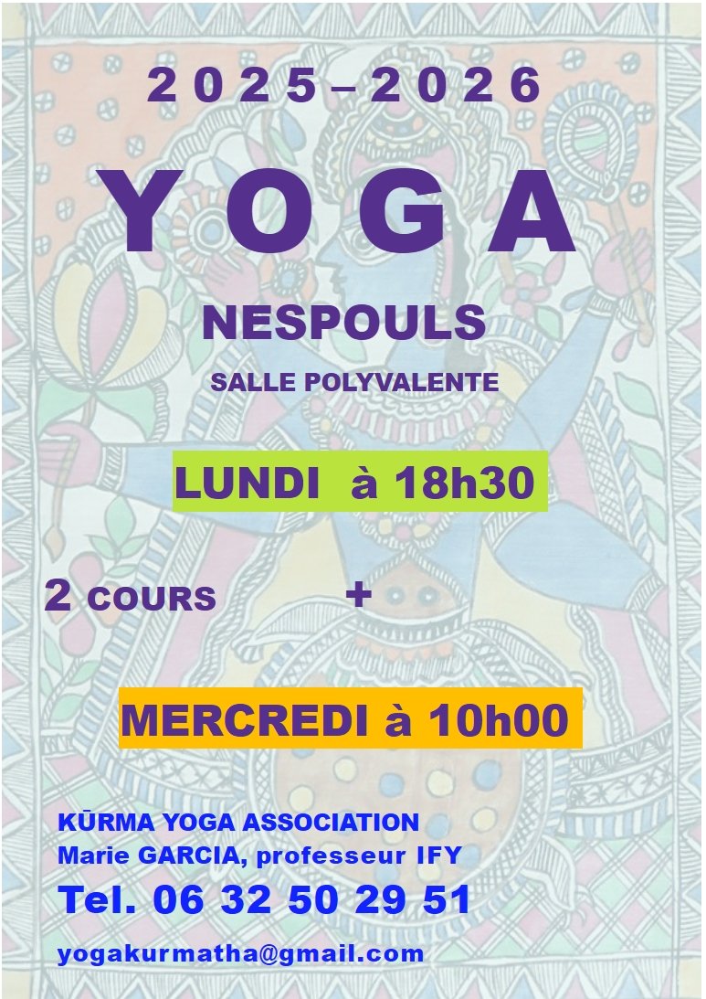 Les cours de yoga ont redémarré avec Marie GARCIA à la salle polyvalente de Nespouls depuis le lundi 15 septembre 2025.