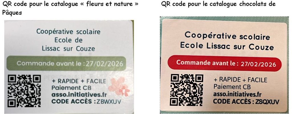 L’école de Lissac propose une vente de chocolats et à l’approche du printemps, une vente «fleurs et nature » afin de financer nos projets pédagogiques. Vous trouverez quelques bons de commande et catalogues au secrétariat de la mairie. Vous pouvez également scanner le QR code. Les affiches sont disponibles au tableau d’affichage de l’école.