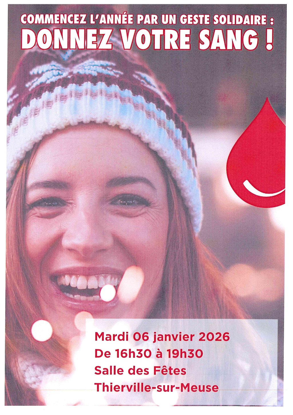 Don du sang le 06/01/2026 de 16h30 à 19h30 à la Salle des Fêtes de Thierville-sur-Meuse