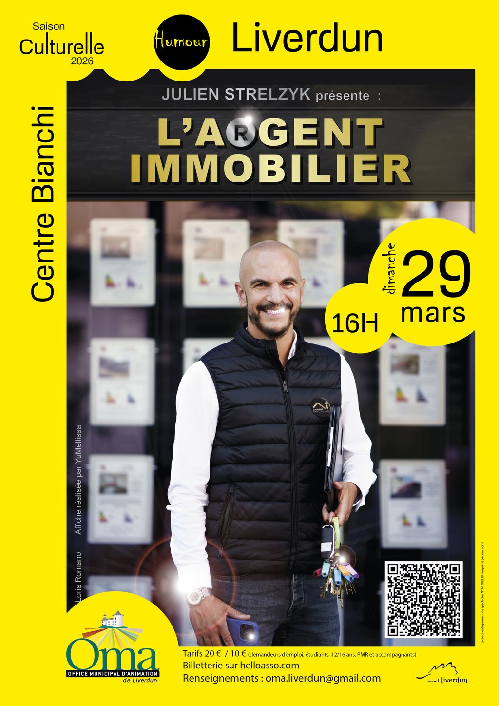 L'OMA fait revenir l'humoriste Julien Strelzyk à Liverdun dimanche 29 mars à 16h au Centre Bianchi pour son dernier spectacle "l'Argent immobilier".