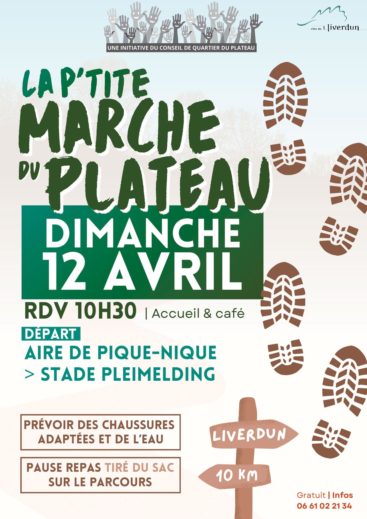 Le conseil de quartier du Plateau vous donne rendez-vous dimanche 12 avril à 10h30 à l'aire de pique-nique (derrière le stade Pleimelding) pour une marche familiale de 10 km à travers les sentiers liverdunois.