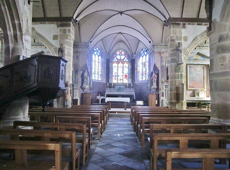 On la découvre sur la route qui mène à L’Hôpital-Camfrout. Dans son ensemble, elle est de style gothique et possède un élégant clocher Renaissance. Elle comprend une nef de trois travées avec bas-côtés, un transept et un chœur polygonal. Deux clochetons ornent la façade. La forme des fenêtrages et les dates portées sur la porte ouest, 1603, et sur le bénitier nord, 1692, permettent de dater le sanctuaire qui, en 1890, lors d’une restauration, subit une modification architecturale majeure : une chapelle, ainsi qu’une sacristie, sont ajoutées au bâtiment. Le bas-côté sud et le chevet datent de cette période. La transformation du double toit en un seul faîtage, également décidée à cette époque, n’a visiblement pas été réalisée, la toiture des bas-côtés se trouvant toujours en discontinuité par rapport à la toiture principale.
