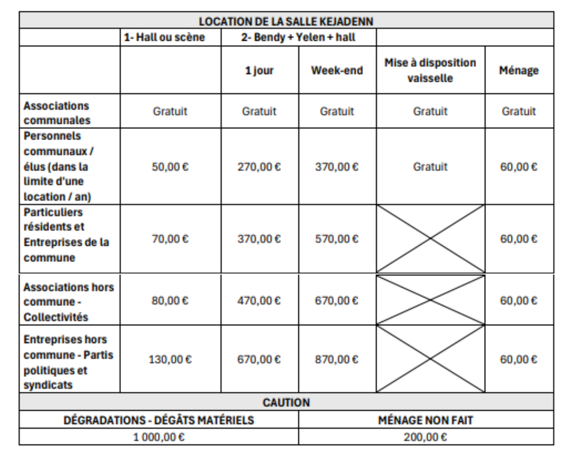 TARIFS DE LOCATION