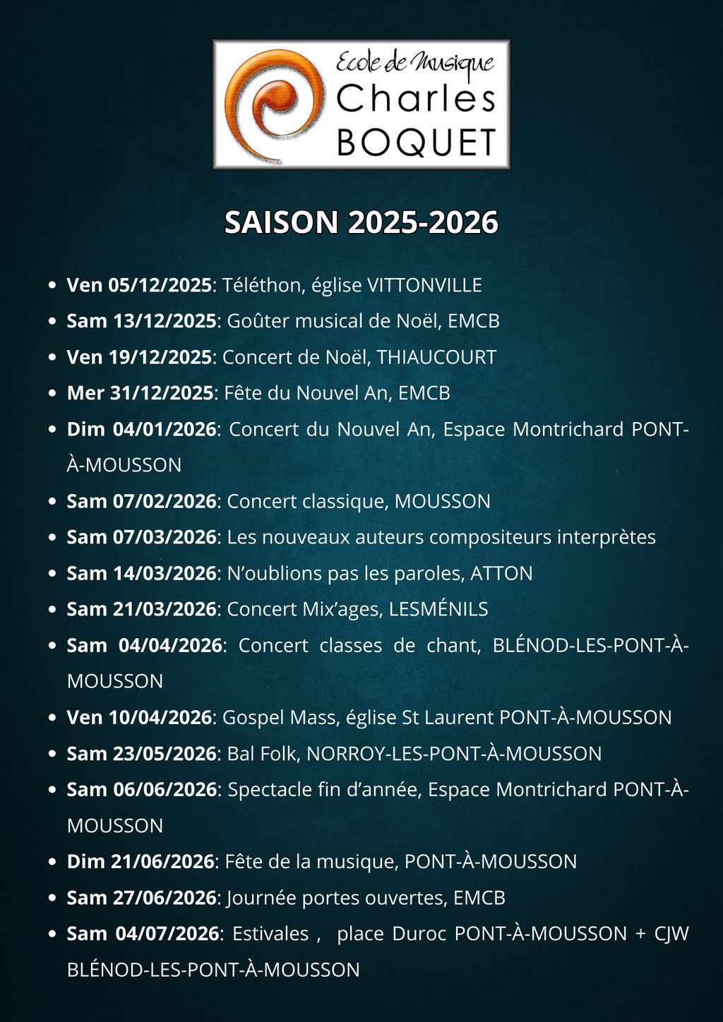 Saison musicale de l'école de musique Charles BOQUET pour l'année scolaire 2025/2026
