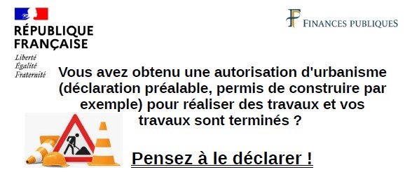 Le Service des impôts foncier (SDIF) de Meurthe-et-Moselle nous informe que dans le cadre des autorisations d’urbanisme accordées des obligations déclaratives sont à effectuer et se résument par la déclaration d'achèvement auprès de la mairie (DAACT) et la déclaration fiscale d'achèvement de travaux auprès du service départemental des impôts foncier (SDIF) de Meurthe-et-Moselle.