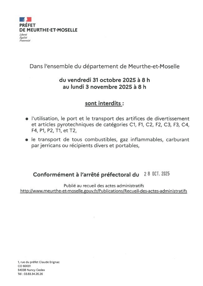Je vous prie de bien vouloir trouver ci-joint l'arrêté préfectoral de ce jour par lequel le préfet de Meurthe-et-Moselle réglemente de manière temporaire l'utilisation, le port et le transport des artifices de divertissement et articles pyrotechniques ainsi que le transport de carburant, à l'occasion de la période dite d'"Halloween".