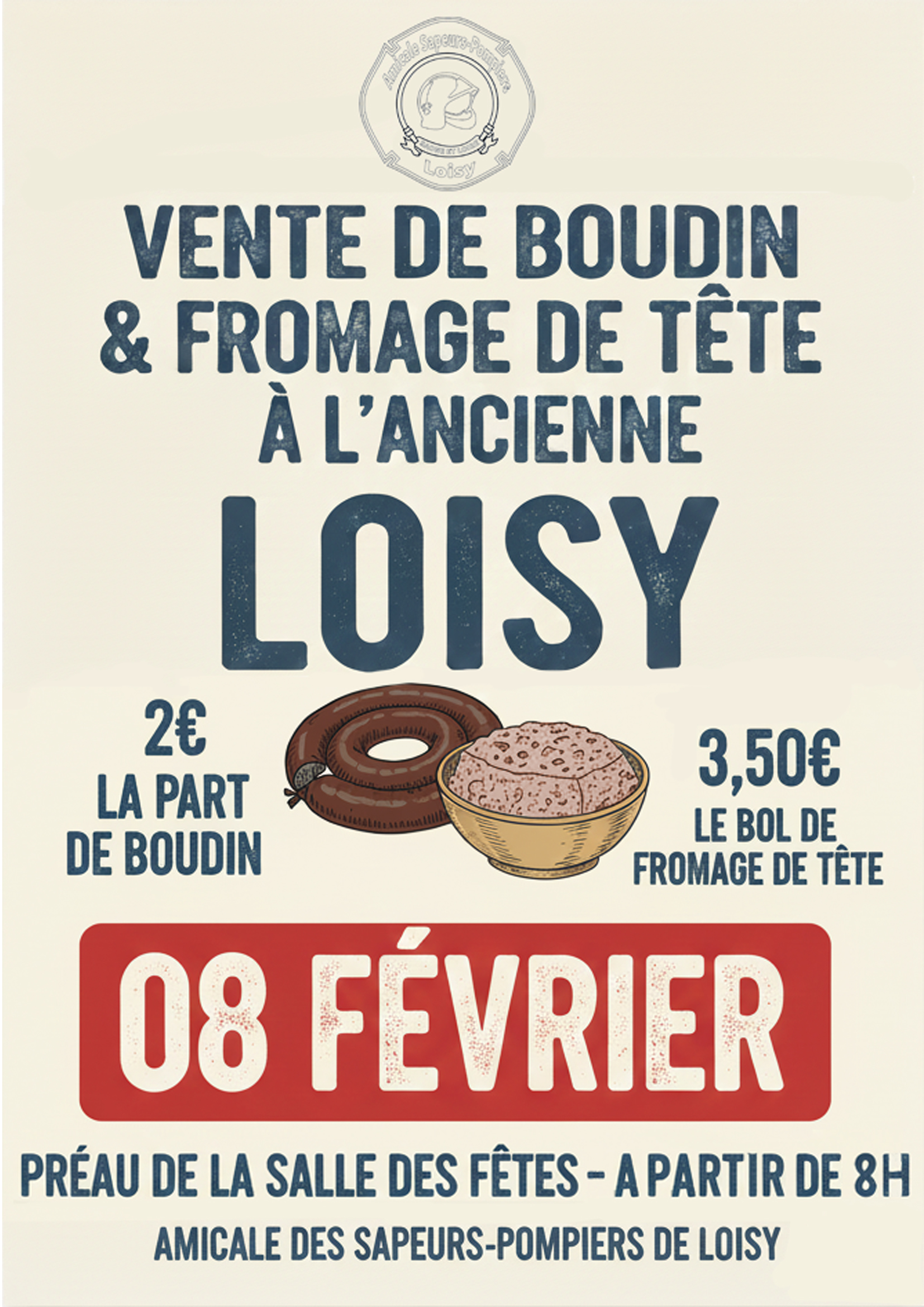 L'Amicale des Sapeurs-Pompiers de Loisy organise sa traditionnelle vente de boudin et fromage de tête le dimanche 8 février sous le préau de la salle des fêtes.