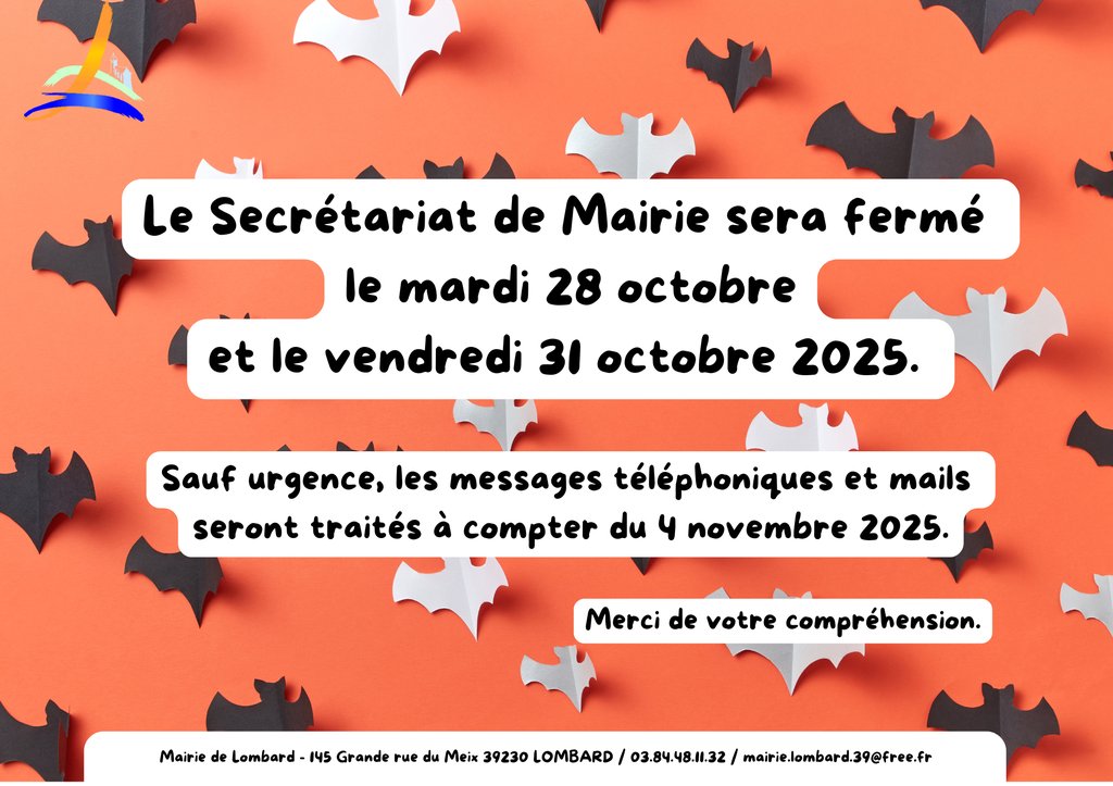 Fermeture du Secrétariat de Mairie le mardi 28 et le vendredi 31 octobre 2025 👻