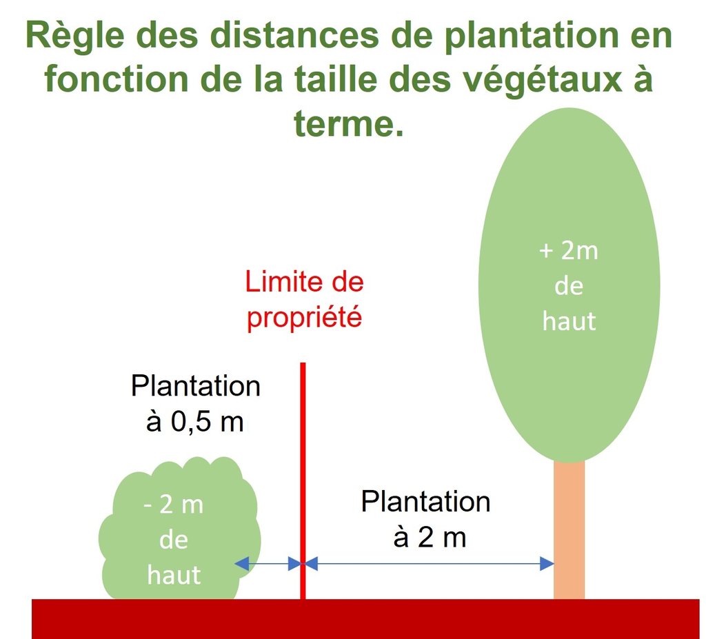 - 2 mètres minimum par rapport aux limites de propriété pour une haie de plus de 2 mètres de haut