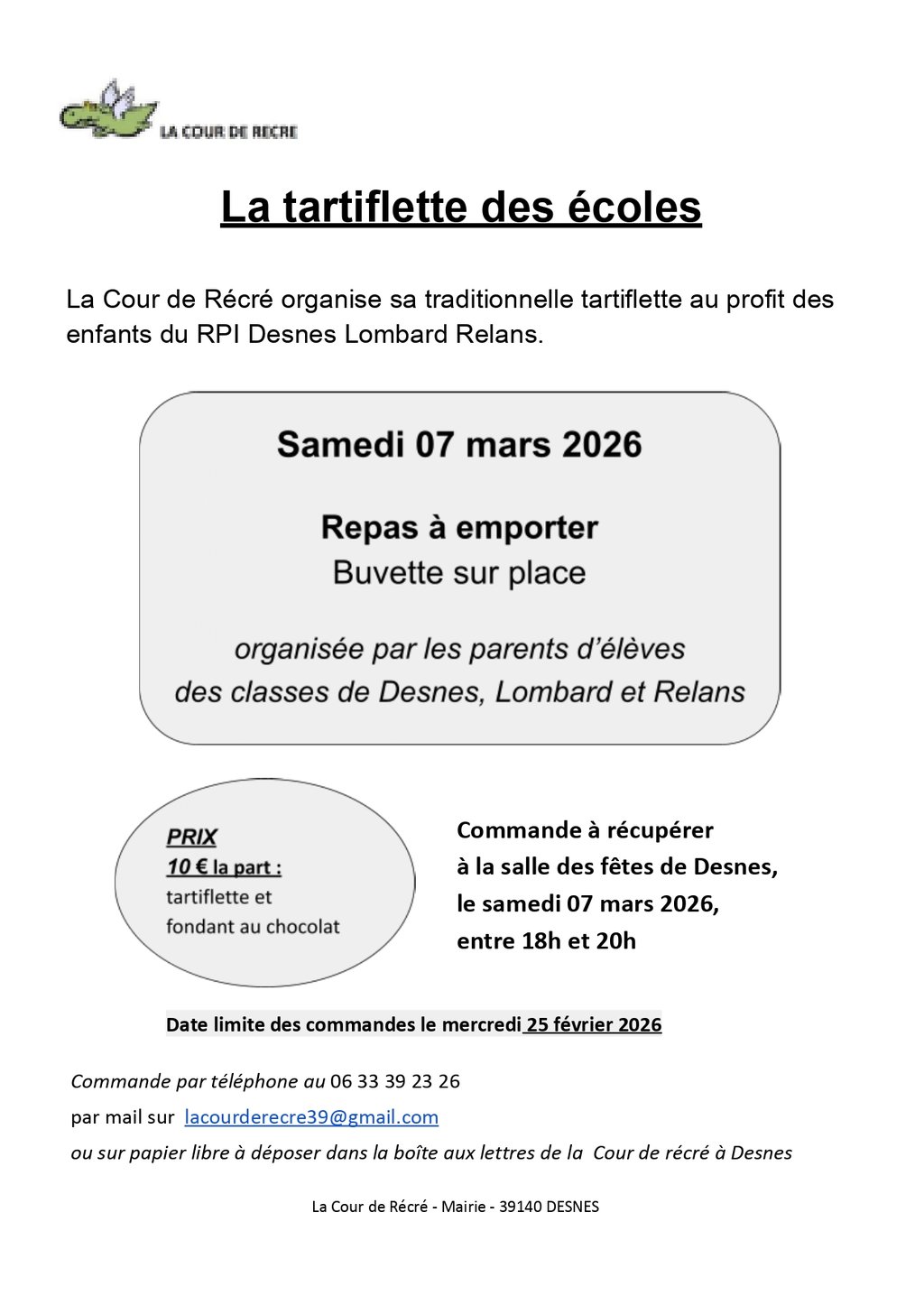 📅 Les commandes sont à récupérer le samedi 7 mars 2026 de 18h00 à 20h00 à la salle des fêtes de Desnes.