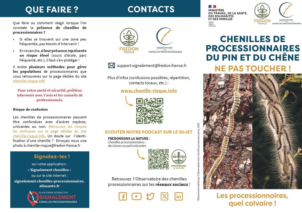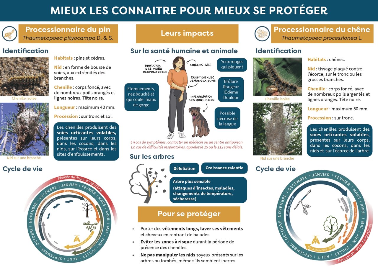 La chenille processionnaire du pin constitue un danger sanitaire reconnu, en raison de ses poils urticants susceptibles de provoquer des atteintes cutanées, oculaires ou respiratoires, notamment chez les enfants et les animaux.