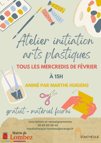 La médiathèque de Lombez vous propose à 15h, tous les mercredis de février, un atelier d'initiation à l'art plastique animé par Marthe Huigens. Gratuit, matériel fourni