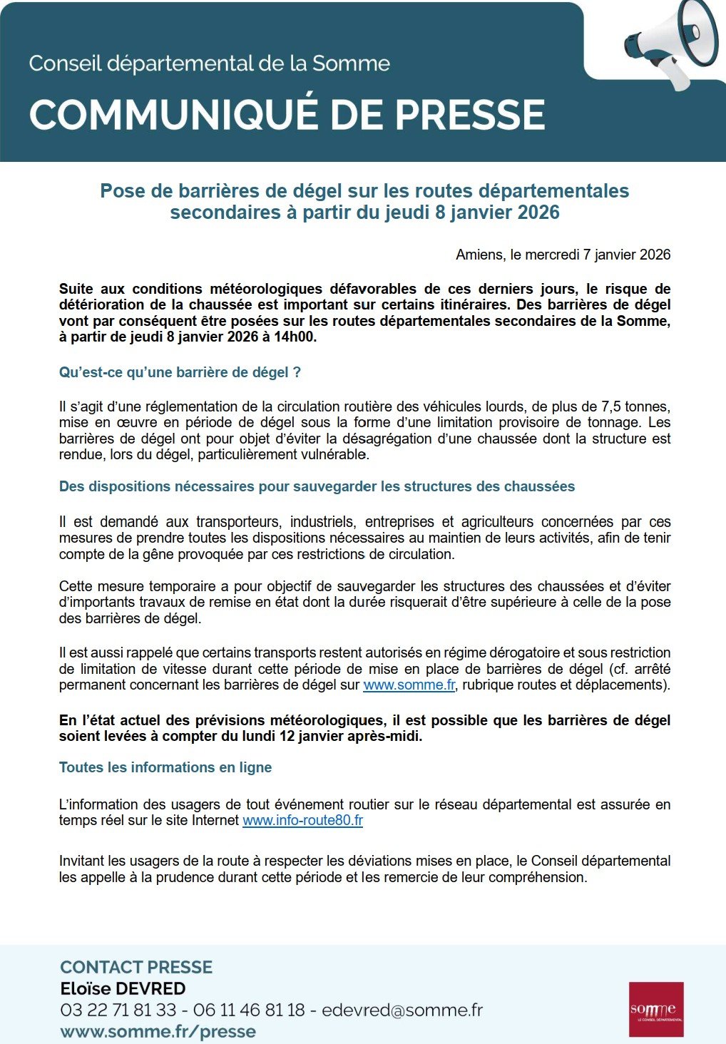Vous trouverez en pièce jointe le communiqué de presse du Conseil départemental de la Somme relatif à la pose de barrières de dégel à compter du jeudi 8 janvier 2026 - 14h.