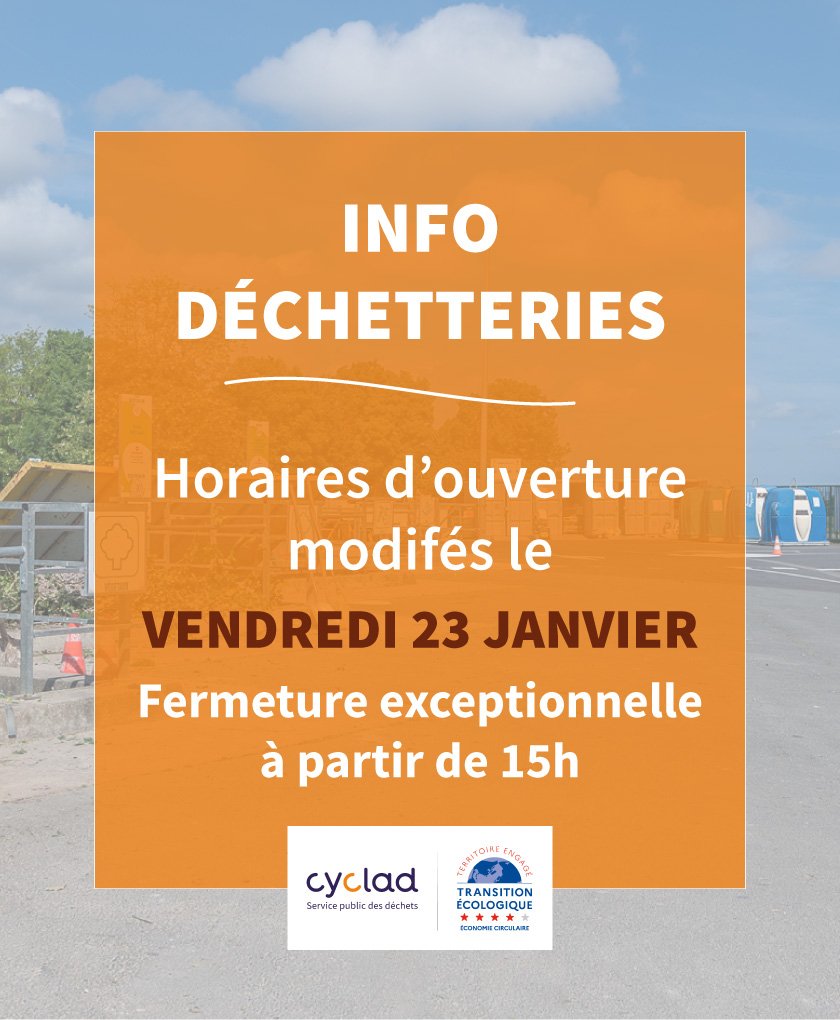 Vendredi 23 janvier toutes les déchetteries et l'accueil de Cyclad ferment exceptionnellement à partir de 15h.
