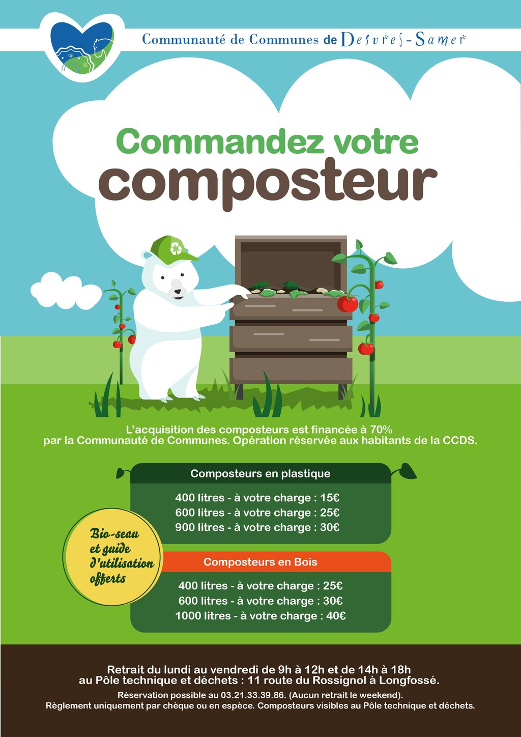 Chaque foyer de l’intercommunalité a la possibilité d’acquérir un composteur adapté à sa production de déchets. L’acquisition des composteurs est financée à 70% par la Communauté de Communes.