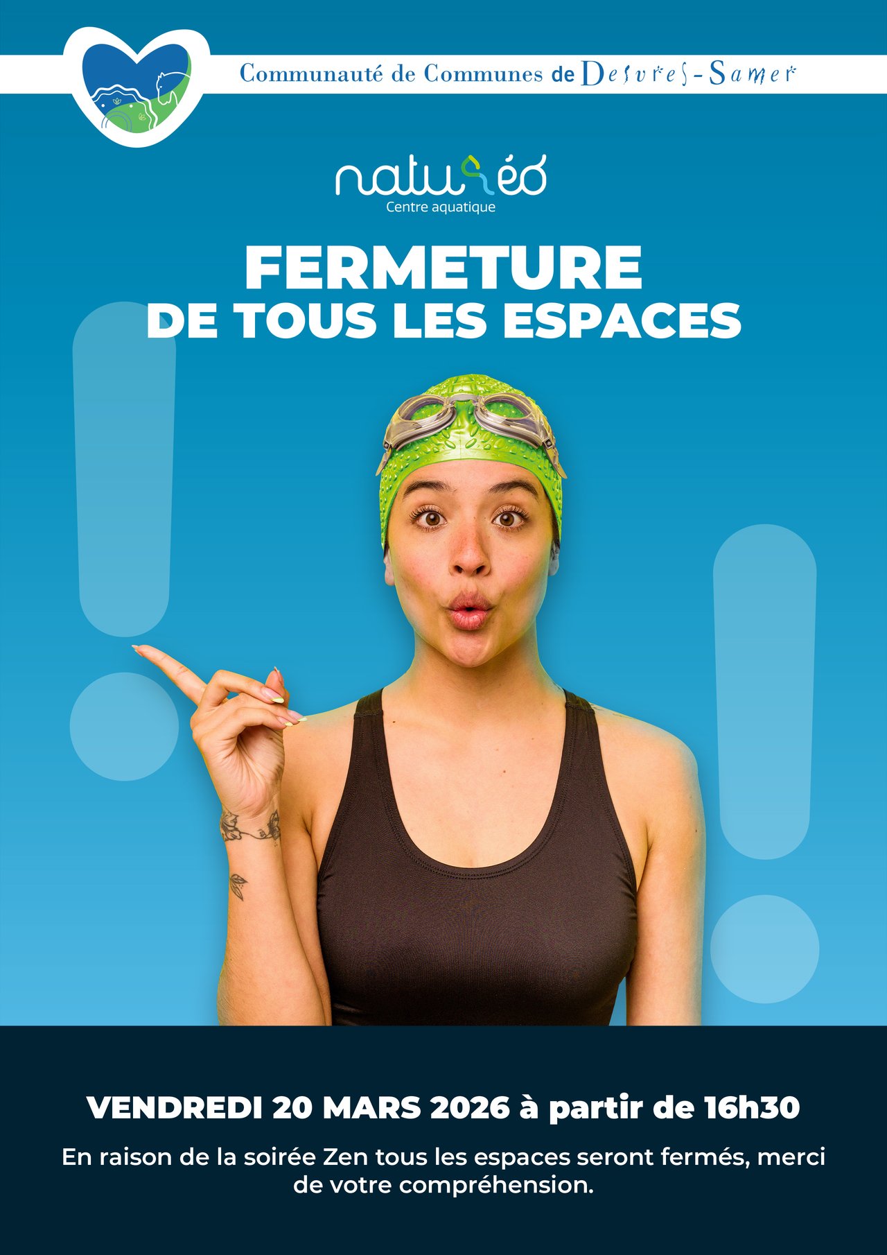 Le centre aquatique Naturéo informe ses usagers que tous les espaces (aquatique, bien-être et fitness) seront exceptionnellement fermés le vendredi 20 mars 2026.