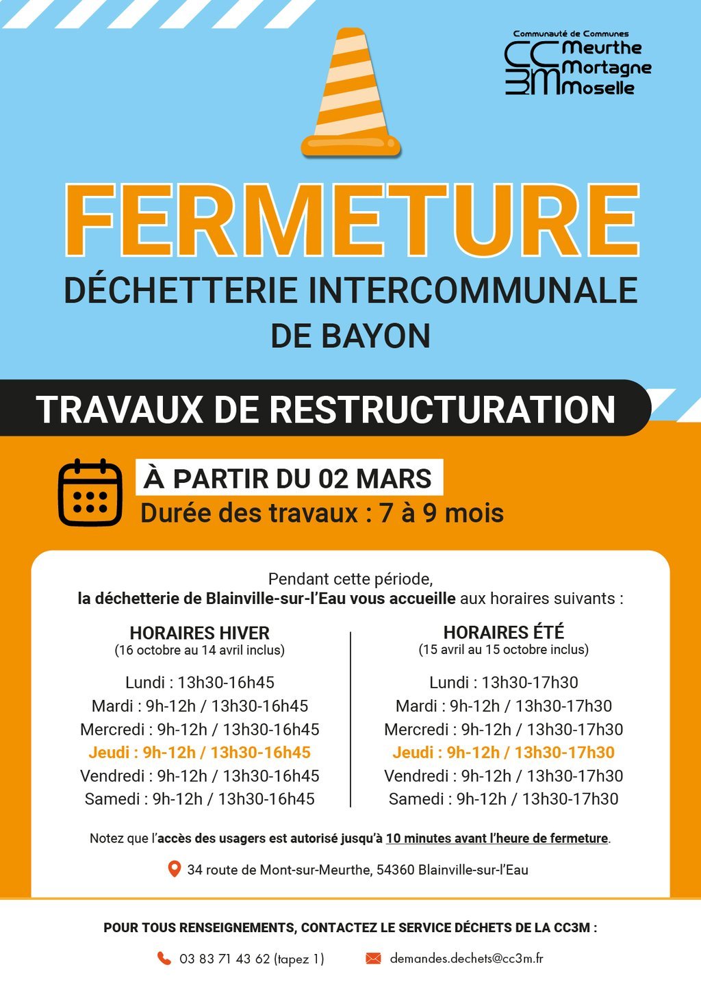 ⚠ En raison de travaux de restructuration, la déchetterie de Bayon sera fermée à partir du 2 mars 2026, pour une durée de 7 à 9 mois.