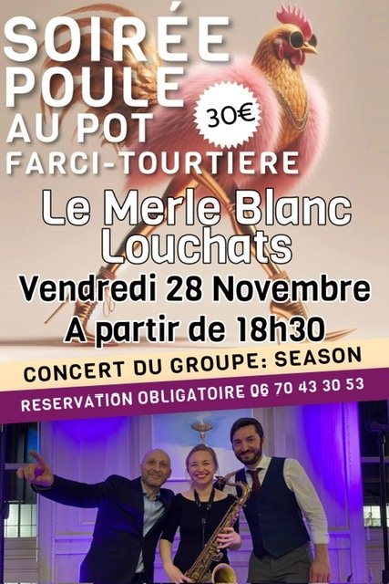 Le Merle blanc à Louchats vous attends le vendredi 28 novembre pour une soirée Jazzy avec le groupe Season agrémentée par une poule au pot